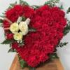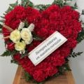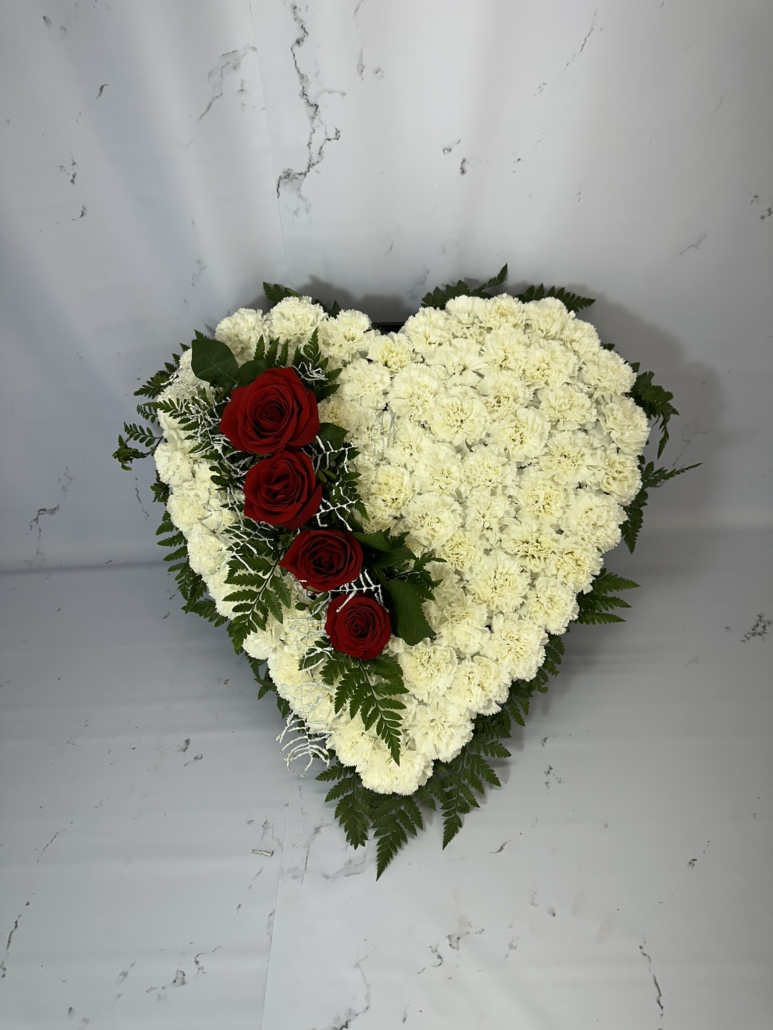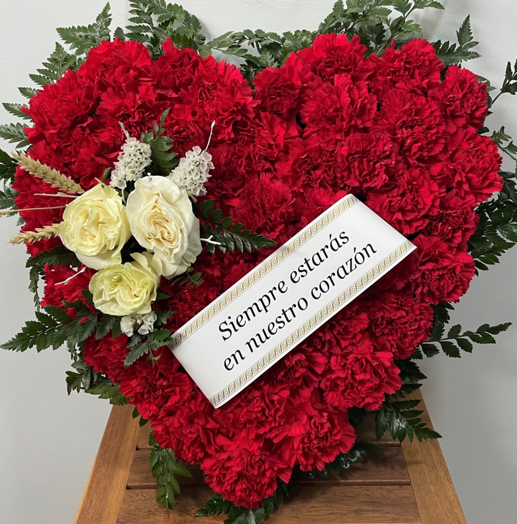 Composición en forma de corazón con base de claveles y elegante detalle en rosas